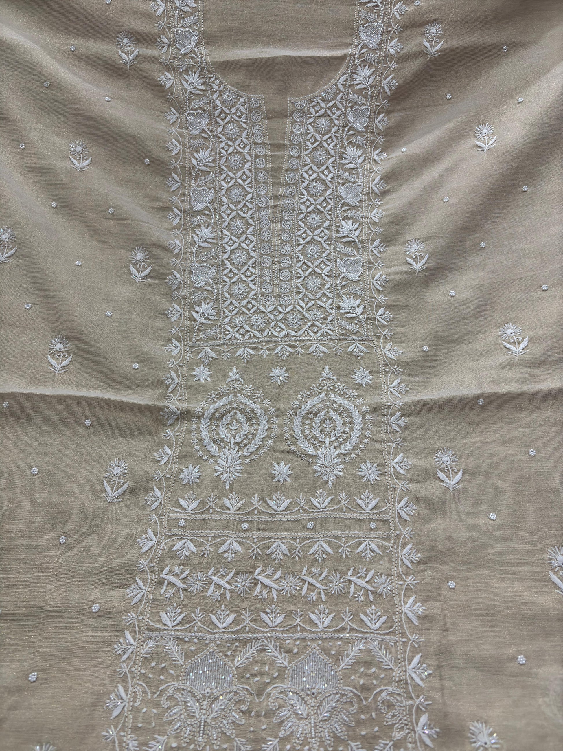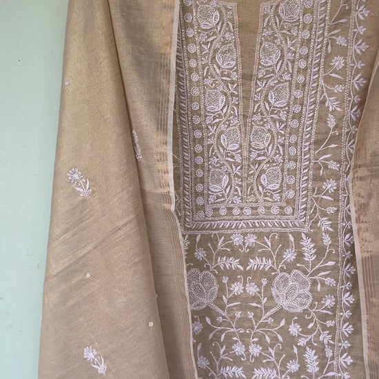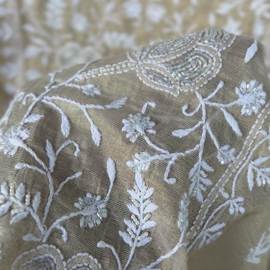 Radiate timeless elegance in this Golden Tissue Chanderi Kurta-Dupatta Set, a luxurious unstitched ensemble that speaks of artisanal beauty. Crafted from lightweight, semi-sheer Tissue Chanderi, the set includes a 2.5-meter kurta fabric and a 2.5-meter dupatta, both intricately hand-embroidered with delicate Cut Dana work. Perfect for festive occasions and special gatherings, this outfit allows you to tailor it your way while embracing the richness of Indian craftsmanship. MOTIF (embroidery pattern) WILL VARY