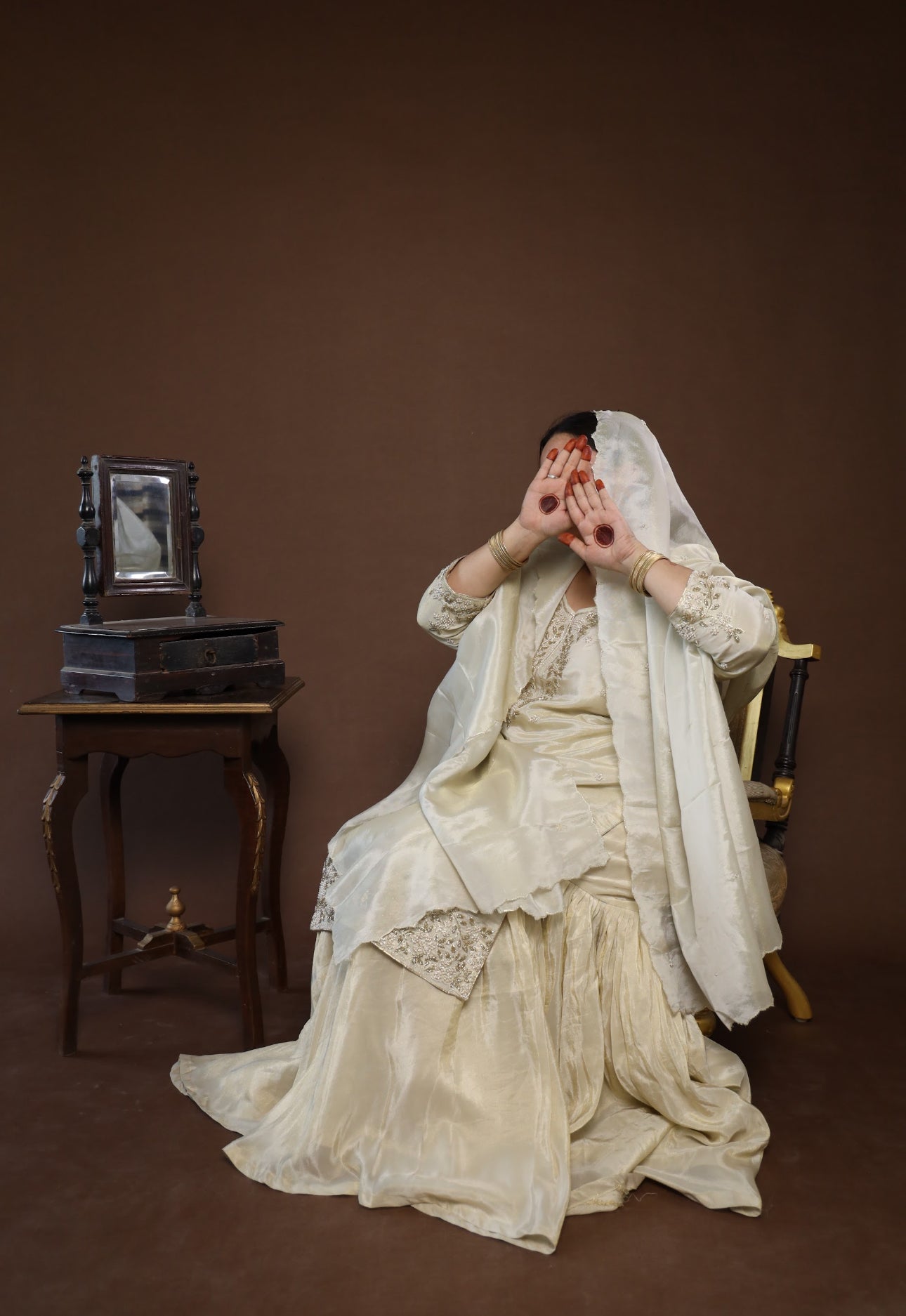 The outfit comes fully stitched and ready to wear, featuring a handcrafted shirt and dupatta adorned with delicate handwork, light butis, and a charming scallop border for a refined traditional touch.
