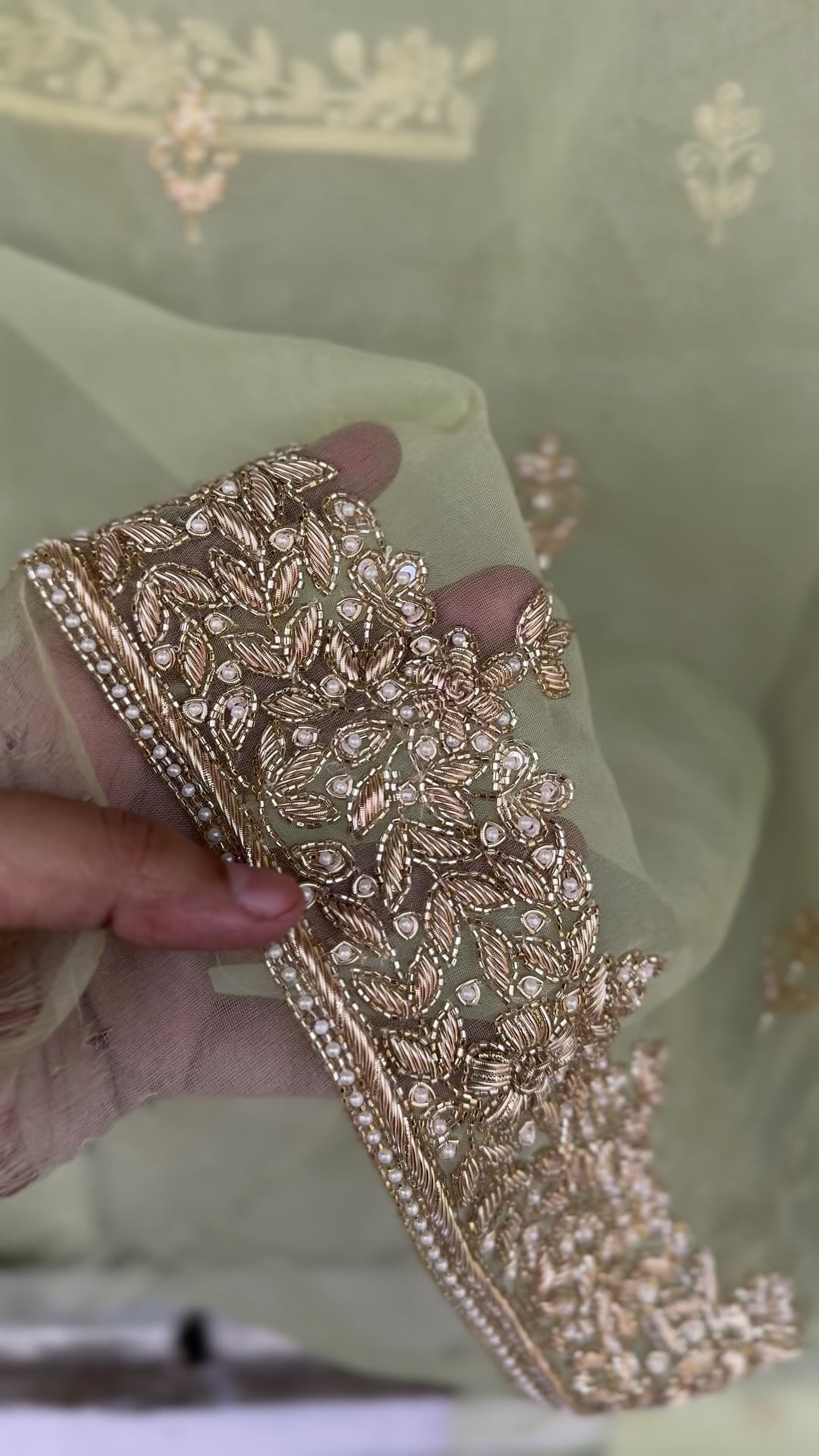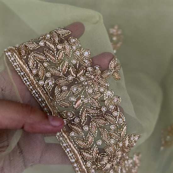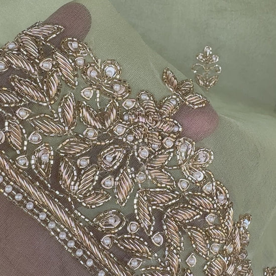 A graceful unstitched organza set in mint green, adorned with intricate zardozi embroidery and delicate pearls. Perfect for festive and formal occasions, with color customization available.